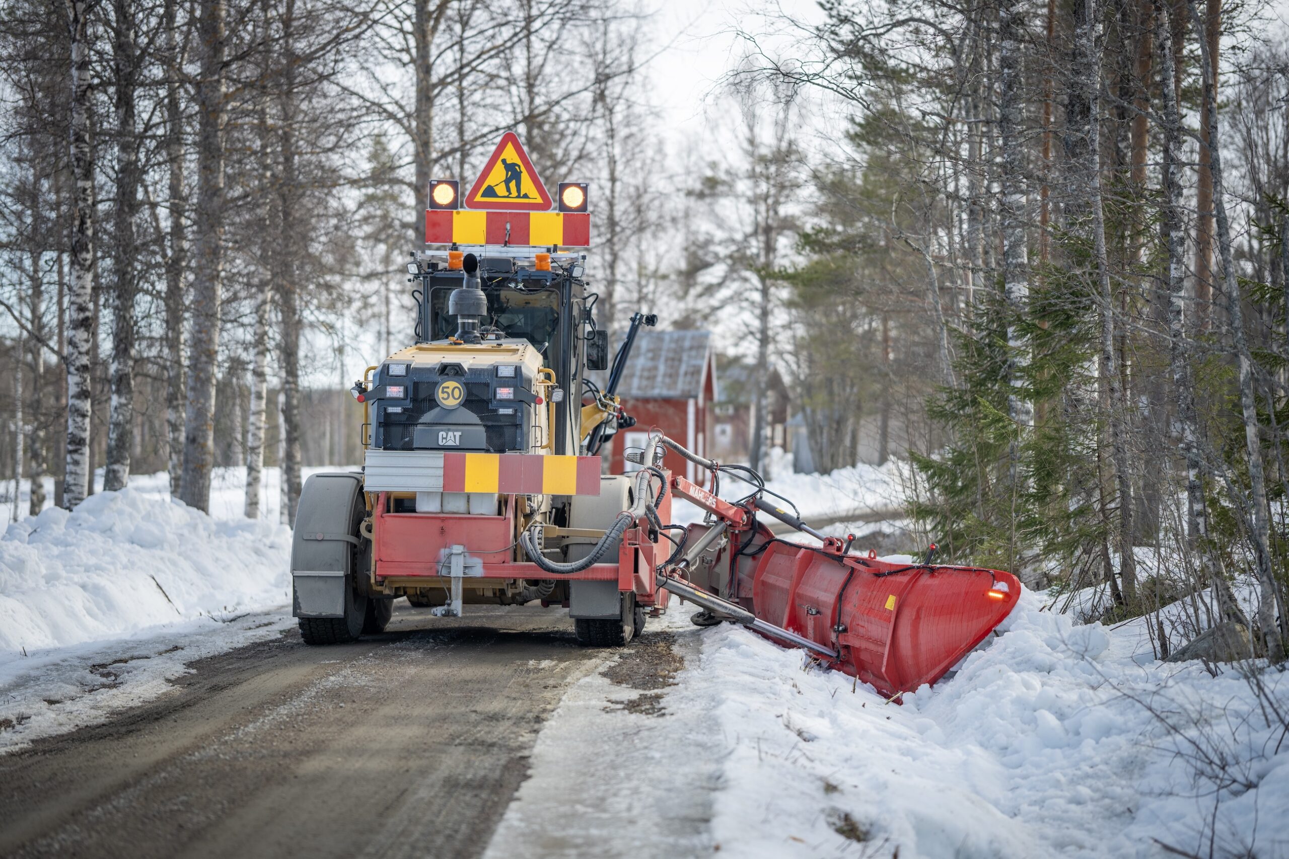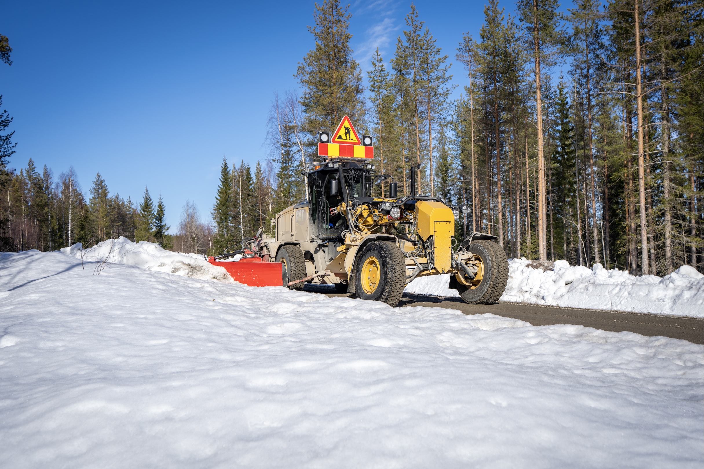 En effektiv metod för att tidigarelägga upptorkningen av grusvägar är snödikning. I skogarna nordväst om Örnsköldsvik håller väghyvelföraren Frank Lundqvist på att bana väg för boende längs en enskild väg med hjälp av Sundbergs Åkeris nya Cat 150 som är utrustad med en sidoplog från Mählers.
