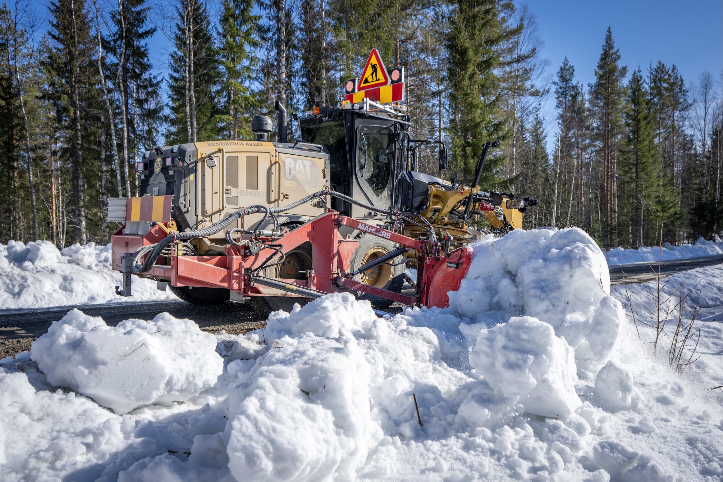 Sundbergs Åkeri i Skorped AB satsar stort på väghyvlar i sin maskinpark. Tre Caterpillar 150M hyvlar är i drift året om, och Mählers News får följa med ut i fält där företagets senaste tillskott – en fabriksny Cat 150M – snödikar skogsbilvägar i trakterna kring Sågbäcksliden, fem mil nordväst om Örnsköldsvik.