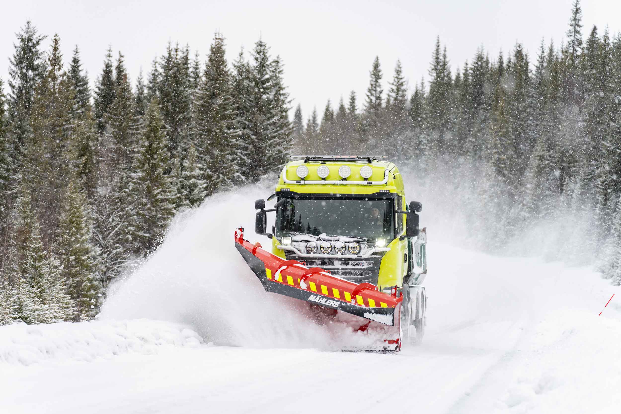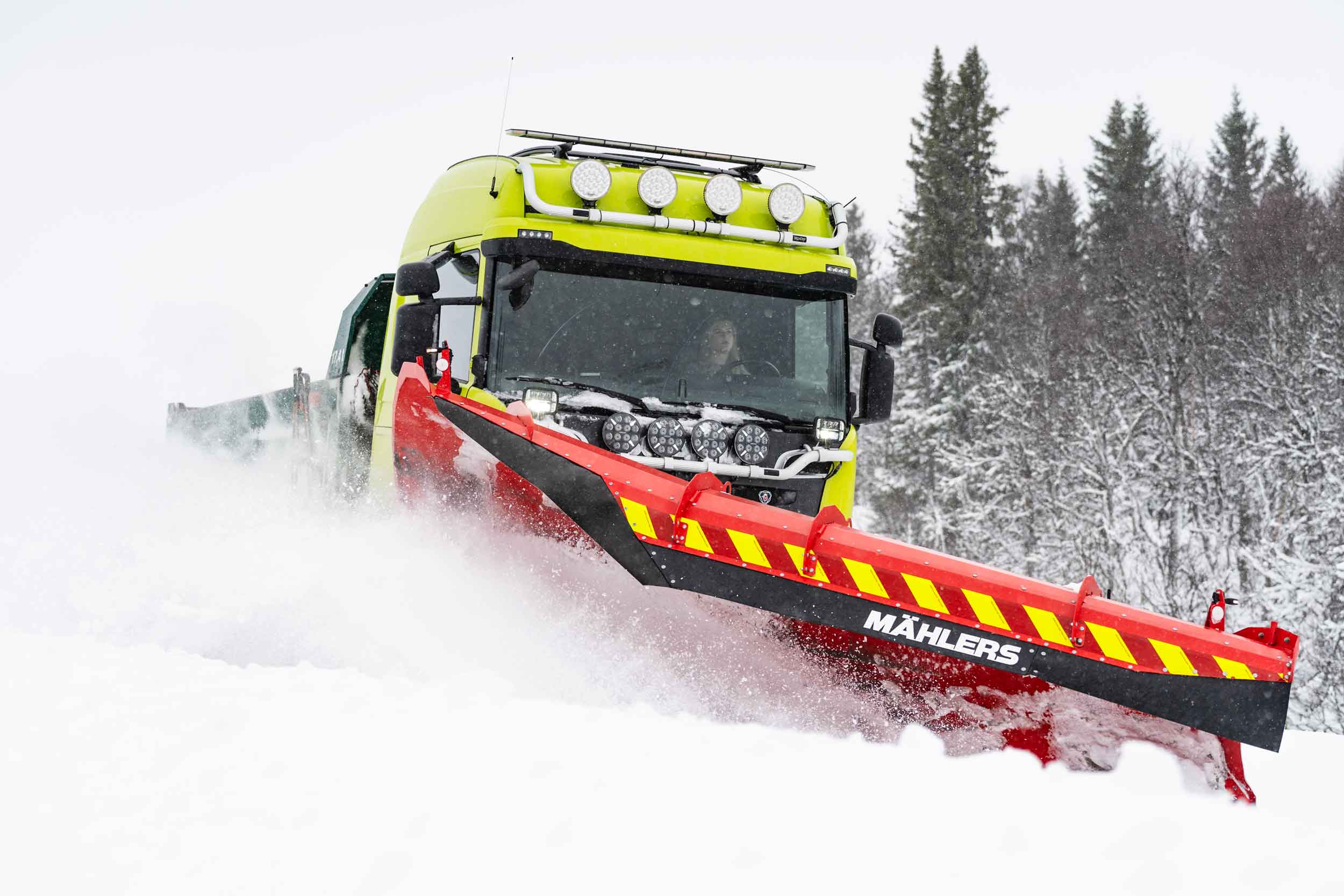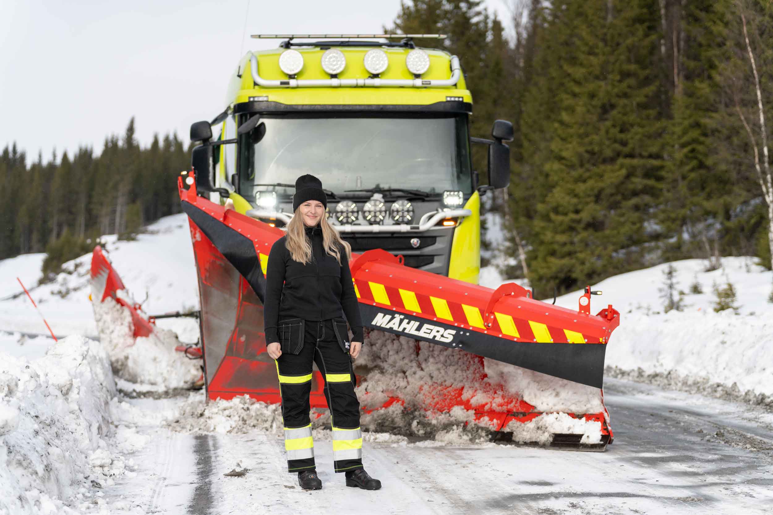 Under plogpassen rattar hon åkeriets Scania R520, utrustad med Mählers högkastande fjällplog DPF, sidoplog SPH och underbett – ett effektivt redskap för att hantera stora mängder snö i kuperad terräng.