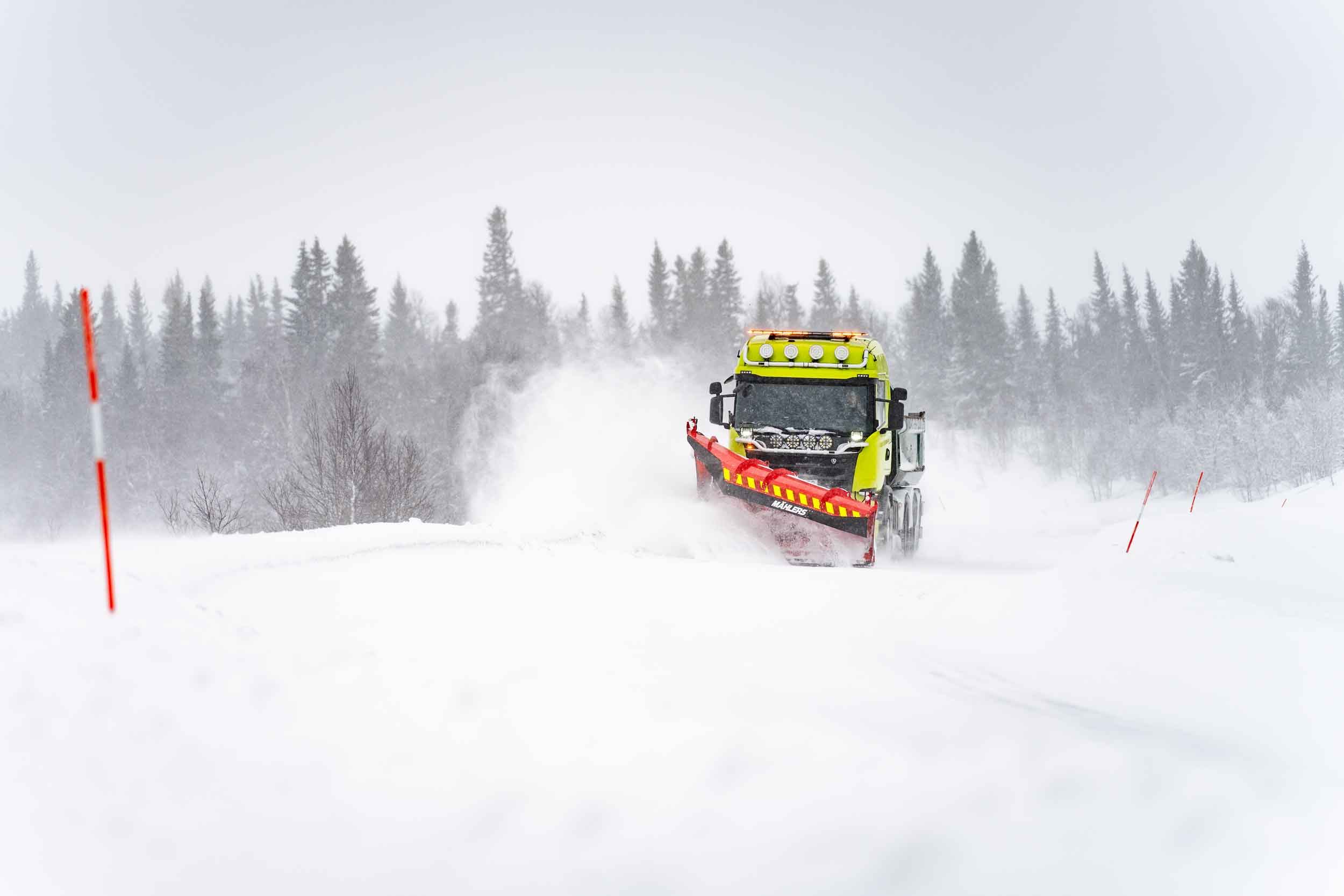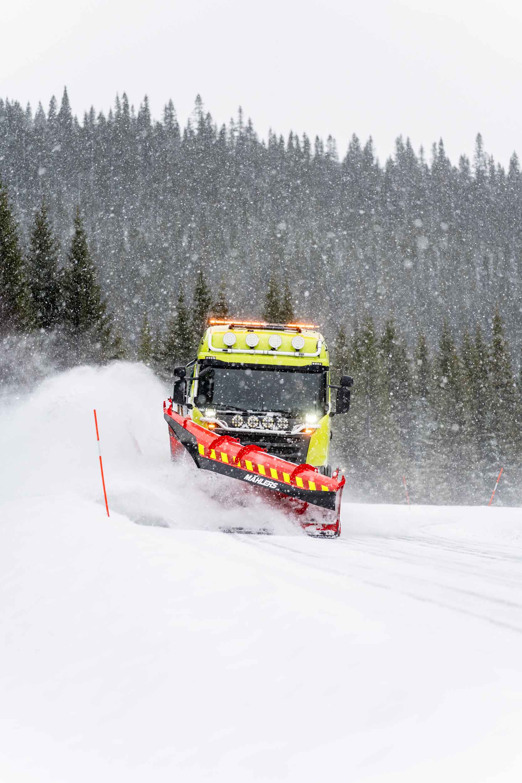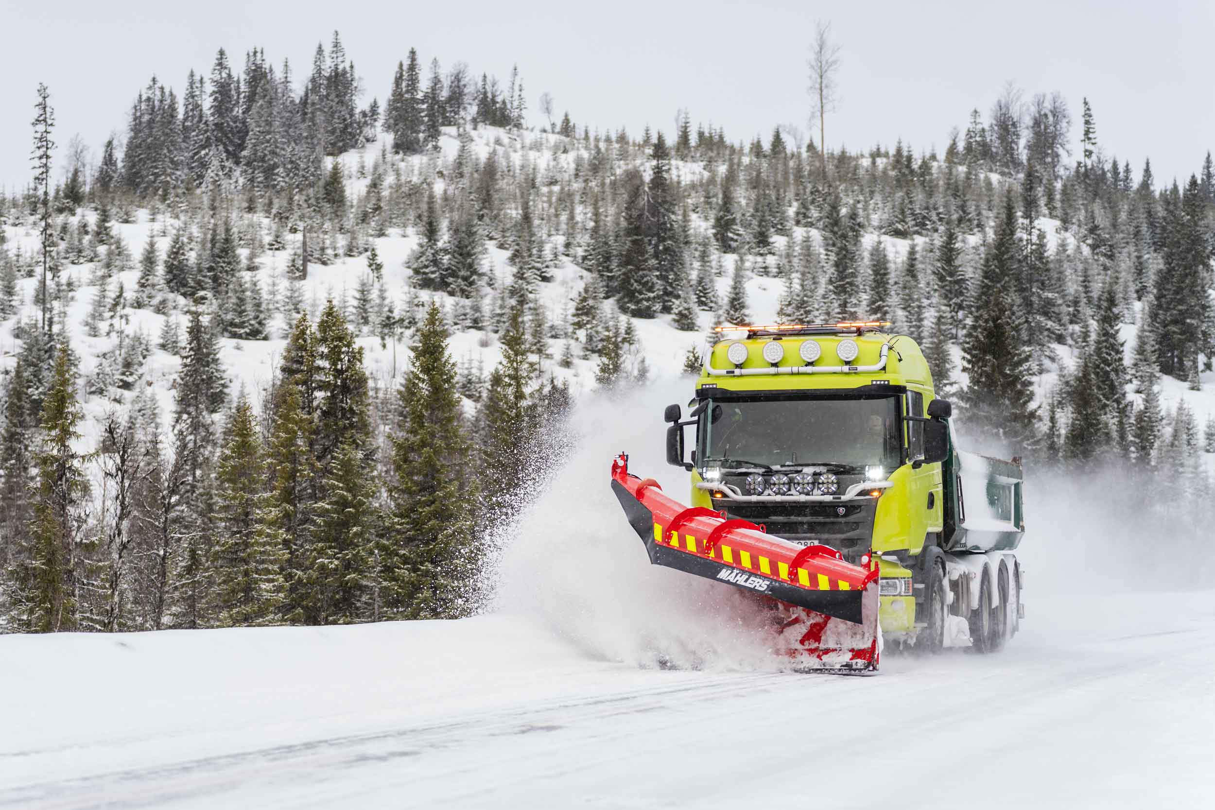 Under plogpassen rattar hon åkeriets Scania R520, utrustad med Mählers högkastande fjällplog DPF, sidoplog SPH och underbett – ett effektivt redskap för att hantera stora mängder snö i kuperad terräng.
